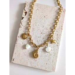 Collier composé de 5 Charms : - Création assemblée à la main - Chaine : acier inoxydable - Breloques : acier inoxydable et perles - Longueur de la chaîne : 42 cm + 5cm