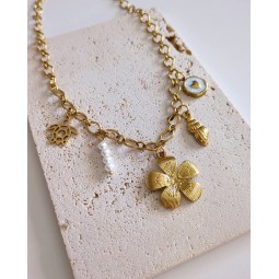Collier composé de 5 Charms : - Création assemblée à la main - Chaine : acier inoxydable - Breloques : acier inoxydable et perles - Longueur de la chaîne : 42 cm + 5cm