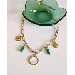 Collier composé de 5 Charms : - Création assemblée à la main - Chaine : acier inoxydable - Breloques : acier inoxydable, résine et nacre - Longueur de la chaîne : 42 cm + 5cm