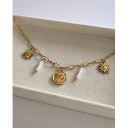 Collier composé de 5 Charms : - Création assemblée à la main - Chaine : acier inoxydable - Breloques : acier inoxydable et perles - Longueur de la chaîne : 42 cm + 5cm