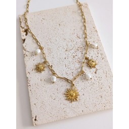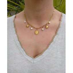 Collier composé de 5 Charms : - Création assemblée à la main - Chaine : acier inoxydable - Breloques : acier inoxydable et perles d'eau douce - Longueur de la chaîne : 42 cm + 5cm