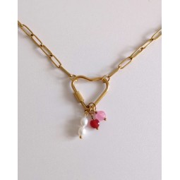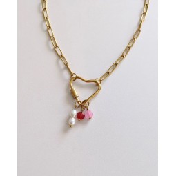 Collier avec fermoir cœur à visser composé de 3 Charms : - Création assemblée à la main - Chaine : acier inoxydable - Breloques : acier inoxydable et perles - Longueur de la chaîne : 42 cm + 5cm