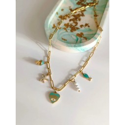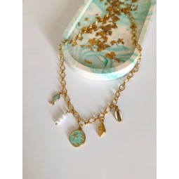 Collier composé de 5 Charms : - Création assemblée à la main - Chaîne en acier inoxydable - Breloques en acier inoxydable, résine et perle - Longueur de la chaîne : 42 cm + 5 cm