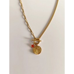 Collier en acier inoxydable avec fermoir T : - Création assemblée à la main - Pendentifs : médaille en acier inoxydable et pierre naturelle Agathe rouge - Longueur de la chaîne : 42 cm