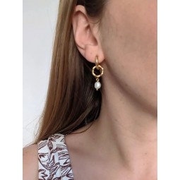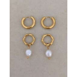 Créoles et anneaux en acier inoxydable et perles d'eau douce. Création assemblée à la main. Dimensions créoles : 16 mm.